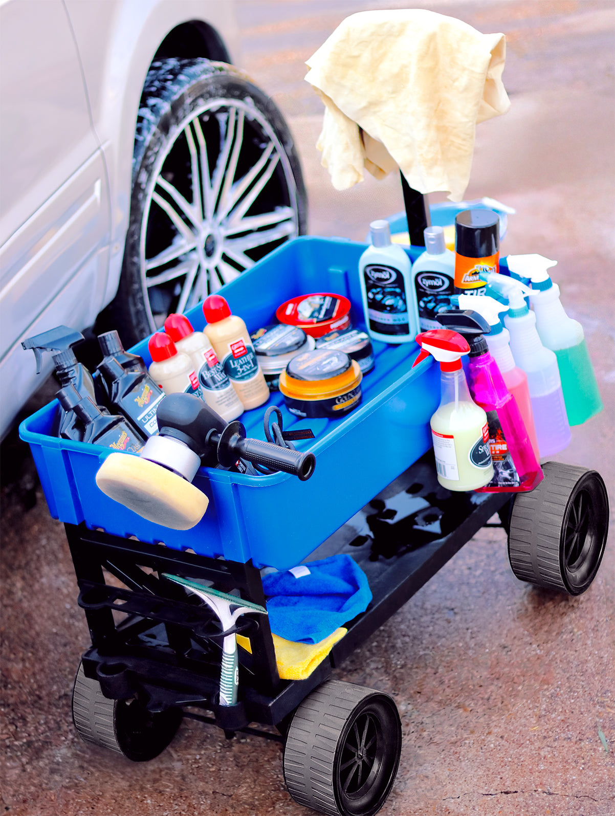 Side view of the durable wheels on a Mighty Max Cart, rolling on concrete.